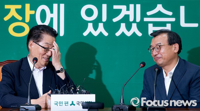 (서울=포커스뉴스) 11일 오후 서울 여의도 국회에서 박지원(왼쪽) 국민의당 비상대책위원장이 이정현 새누리당 대표와 면담을 하고 있다.